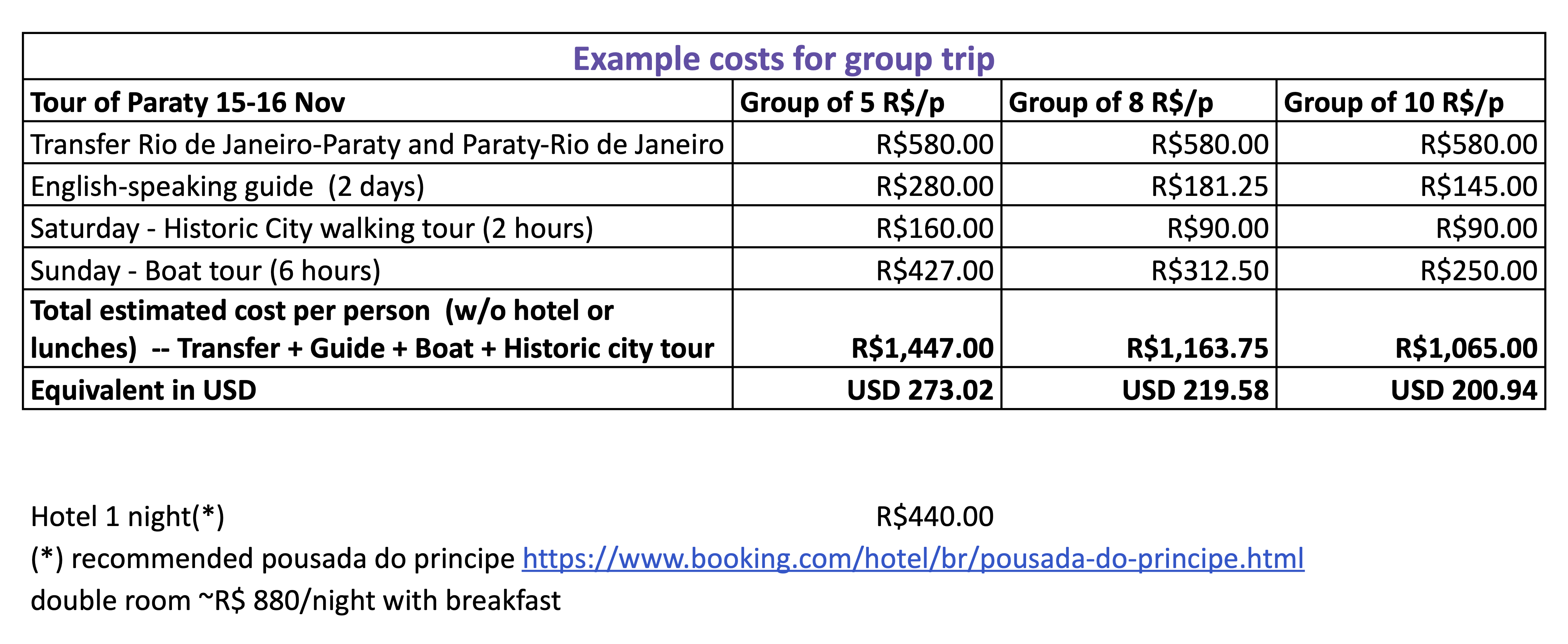 For groups of 5-10 people it is possible to book a private van for the total price of 2070 BRL per trip for the group (so 207-414 BRL per person depending on the size of the group -- about 40 to 80 USD). In this case you can schedule as a group for a common departure time. It could be a good option for people wishing to return to Rio de Janeiro on the afternoon of Sunday November 16th. Take into account that the trip would normally take about 4 hours, but on a Sunday afternoon-early evening, arriving back to Rio de Janeiro, the van can find big traffic jams and extend for 1-2 more hours than at other moments, so plan ahead!