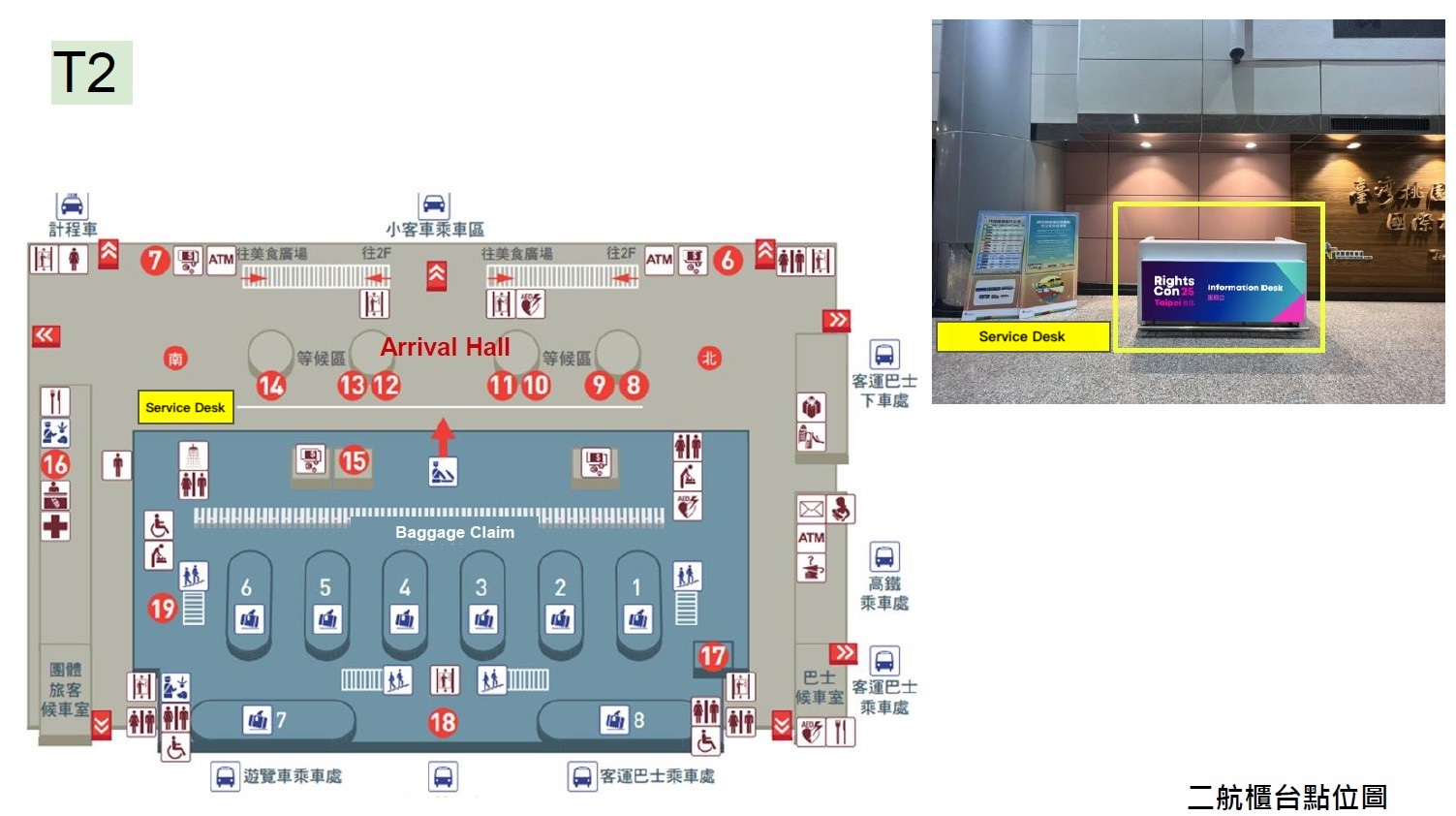 To assist participants, we will set up a service desk at Terminal 2, Taoyuan International Airport (TPE) on September 6, from 12:00 to 21:30, two days before the conference begins. This desk will provide necessary assistance upon arrival. The service desk location can be found below. After you exit customs, please turn left, and you will soon see the service desk on your left-hand side. You can pick up your EasyCard here and use it to take the metro to Taipei.
