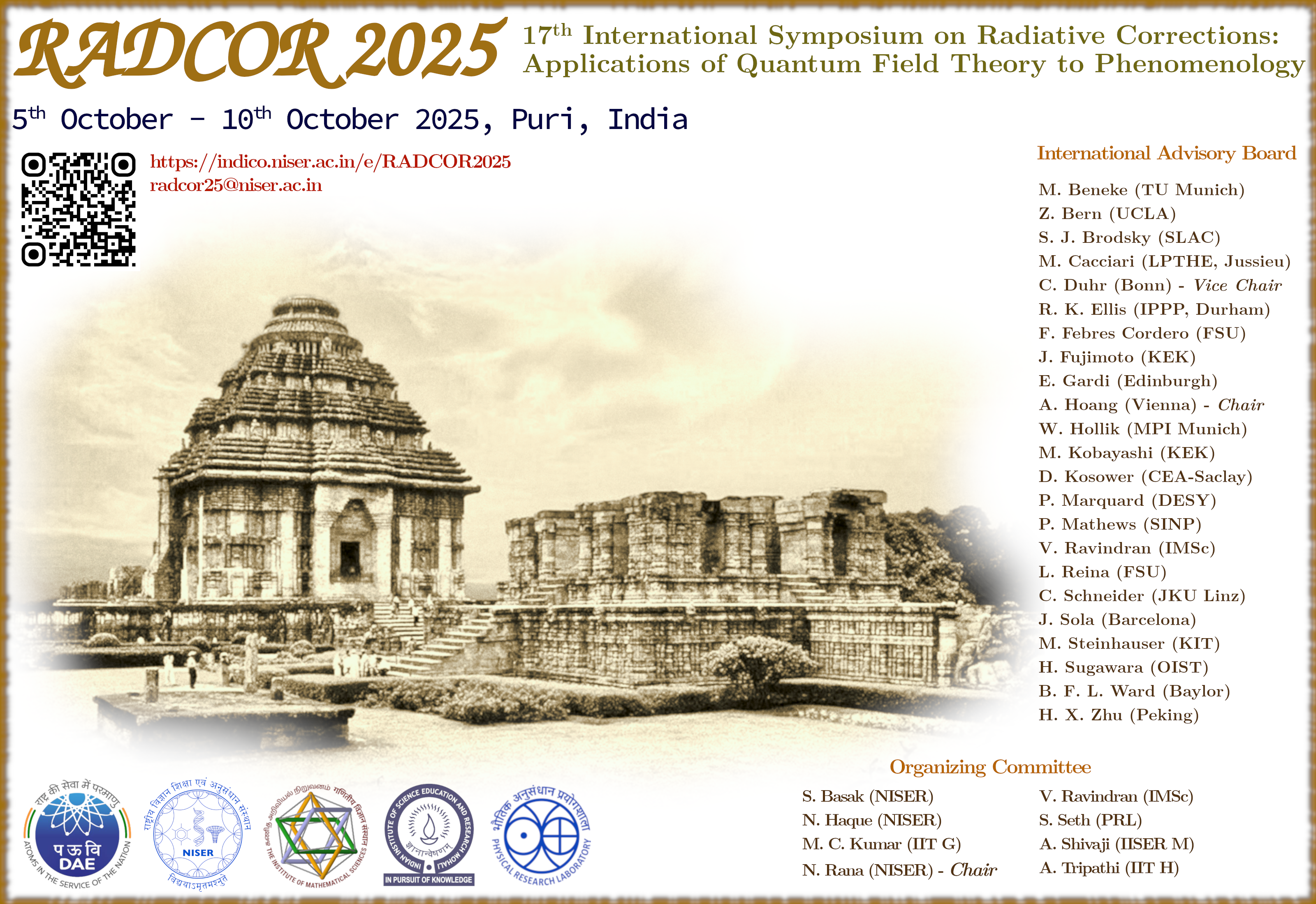 For VISA requirements, a two-step registration procedure will be followed. Anyone interested in participating should pre-register now on the Indico page and submit a copy of the front page of their passport, along with the completed Annex-II form, to radcor25 [AT] niser.ac.in. Pre-registration details are essential for obtaining the DAE approval and a clearance letter from the MEA, India, which is required to apply for a conference VISA. Once we receive your pre-registration details, we will proceed to obtain both the documents, and will notify you upon receipt. For further details, please refer to the visa information page.